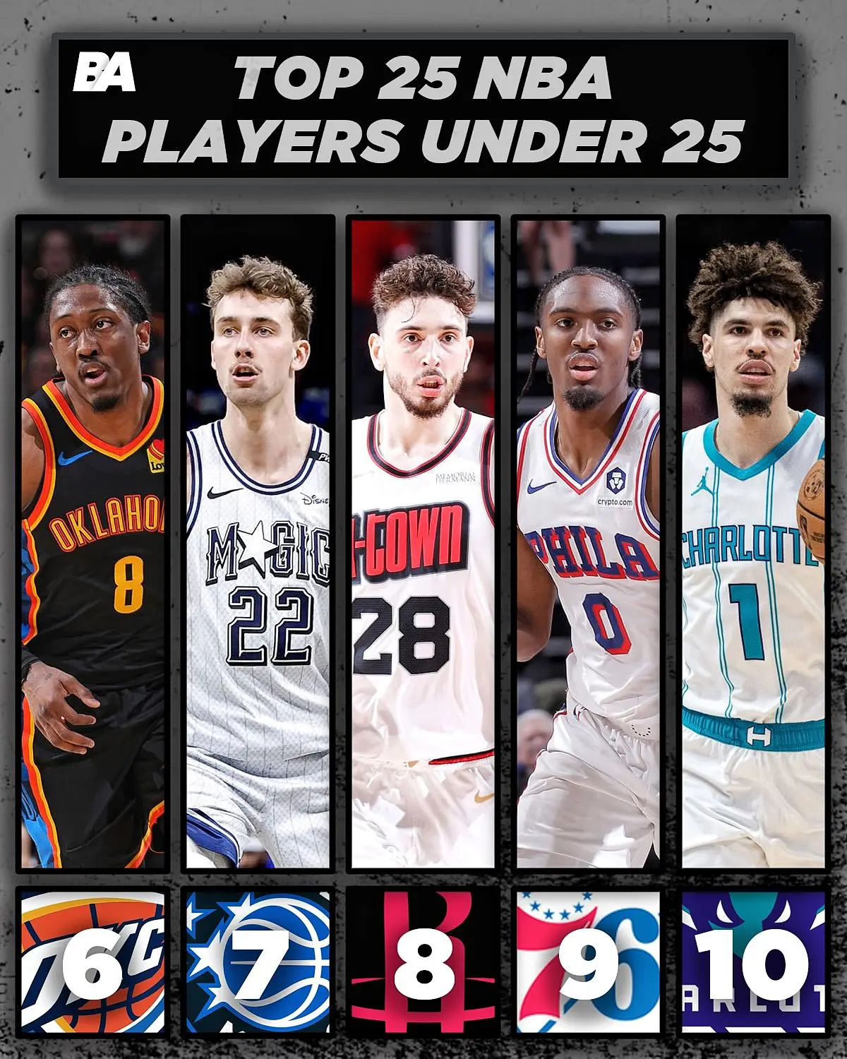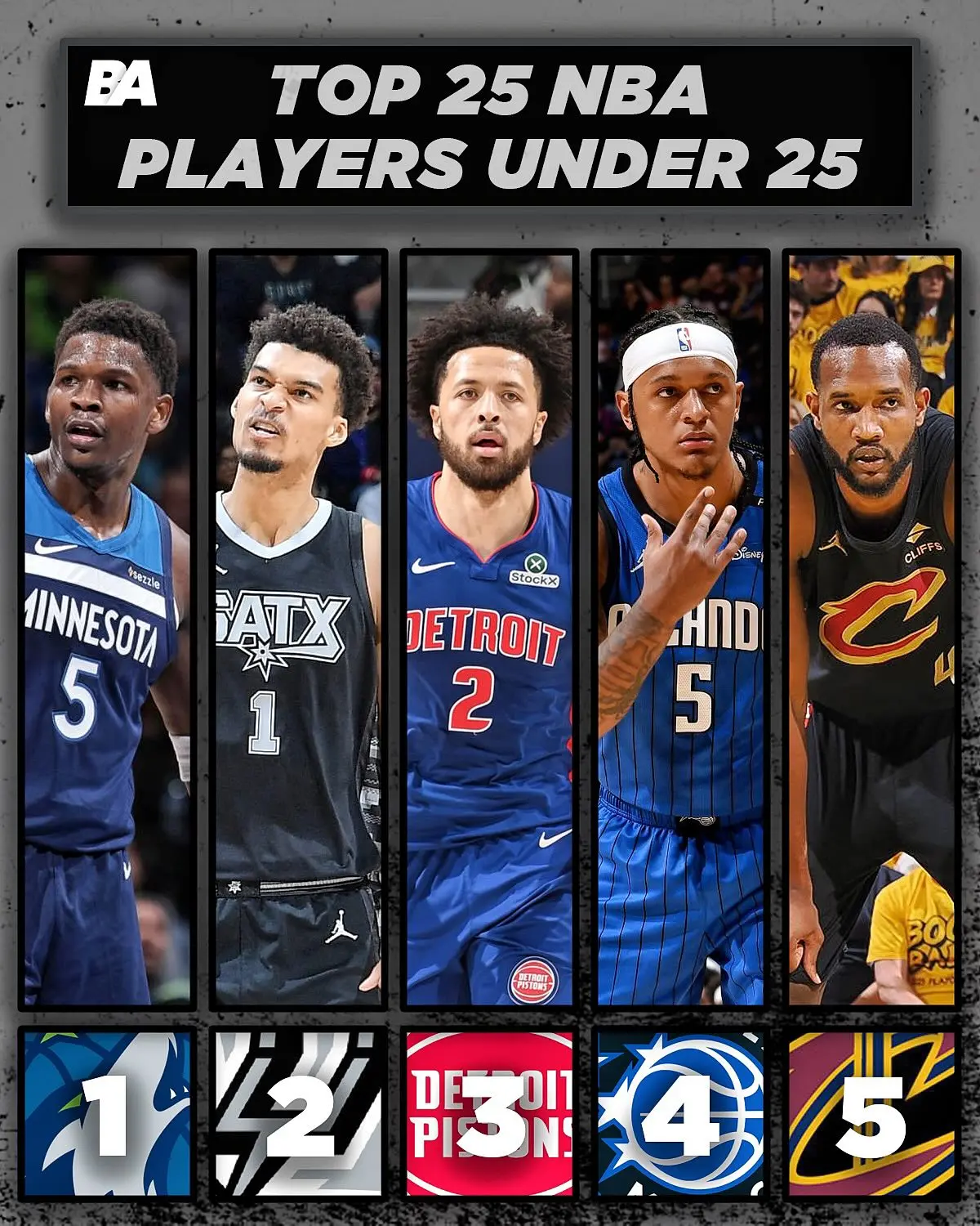 NBA处于一个新老更迭的期间,一些年青球员,也曾杀青了我方的禀赋,展示出了我方具备成为超等巨星的实力。但是,念念要澈底成为一个期间的超等巨星,这是一个额外重荷的进程。为此,好意思媒晒出了现役25岁以下,最佳的25名年青球星,哪些球星能取代詹库杜,打造一个属于我方的期间,让咱们来望望吧! 1-5名:爱德华兹、文班亚马、坎宁安、班切罗、埃文莫布里 前边五东谈主,齐是各自球队的顶级年青球员。但是,能被称为球队首级的,惟有前边四东谈主,埃文莫布里还不行,因为克利夫兰骑士的首级是多诺万米切尔,其次是加兰