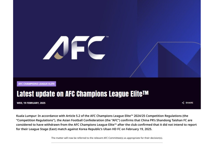 直播吧2月19日讯在亚足联倏得文告山东泰山不进入本轮对阵蔚山HD的比赛,被视为退出本届亚冠精英联赛后,宽广媒体东说念主士通过社媒进行了分析。