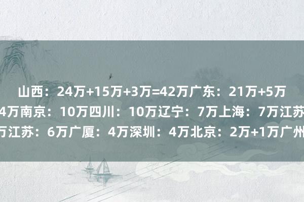 山西:24万+15万+3万=42万广东:21万+5万+6万+3万=35万新疆:34万南京:10万四川:10万辽宁:7万上海:7万江苏:6万广厦:4万深圳:4万北京:2万+1万广州:2万 体育录像/图片