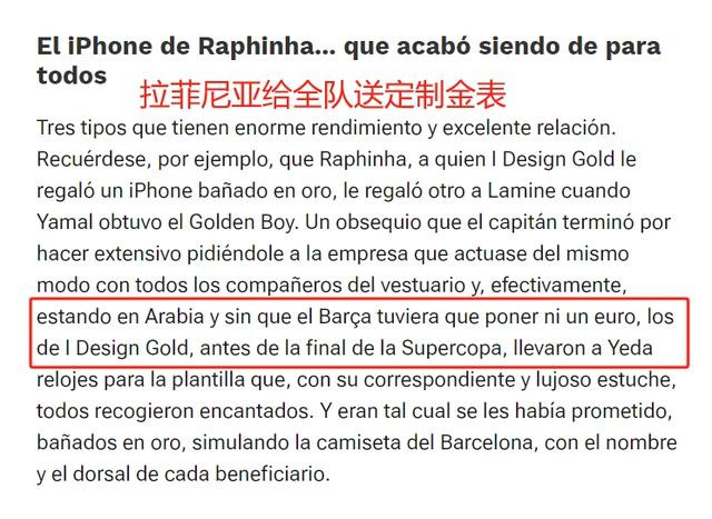 巴萨全队出征沙特时,拉菲尼亚就准备好定制的金腕表。这是由一家名叫I Design Gold公司制作的礼物,金表装在豪华的包装盒里,印有每名球员的名字、球衣号码,格调仿照巴萨球衣。